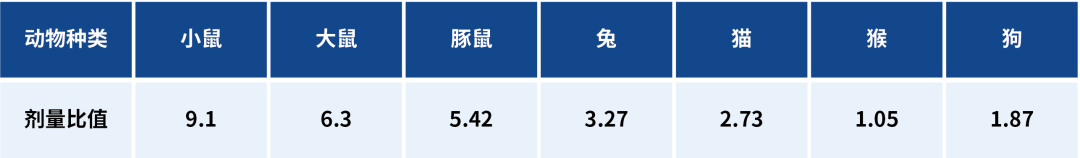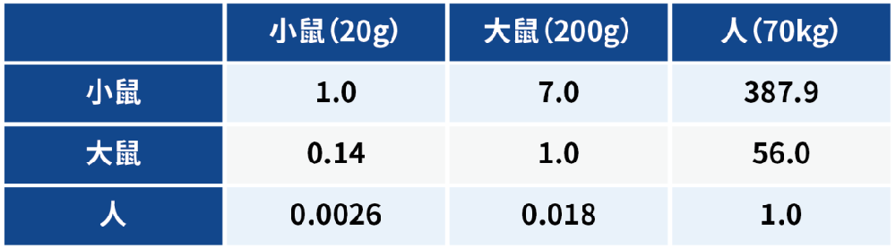 依此类推,我们可以算出小鼠、豚鼠等其它动物剂量与人的比值。